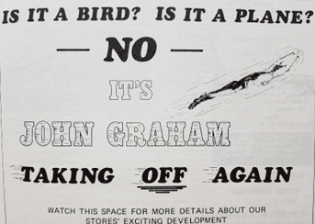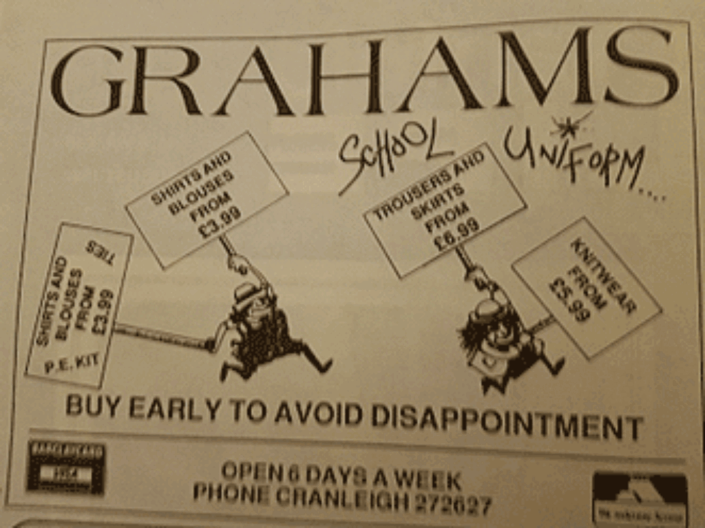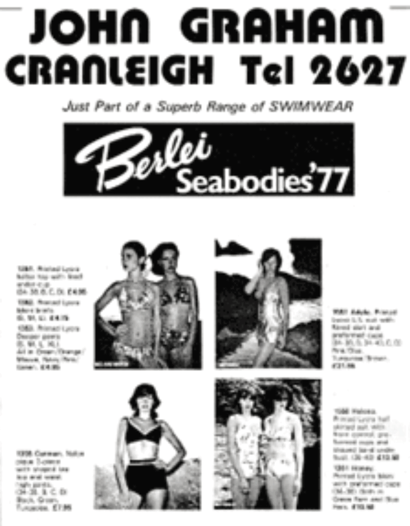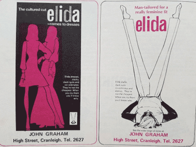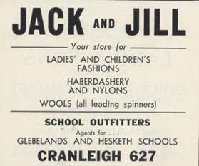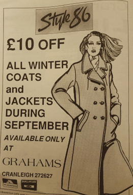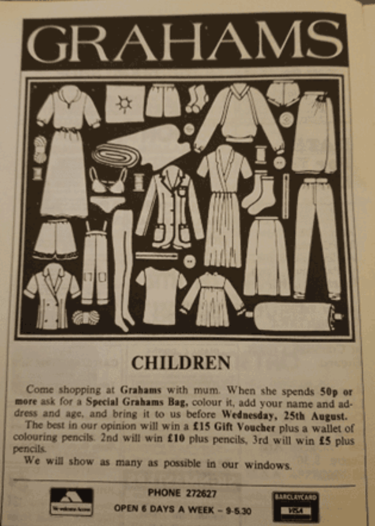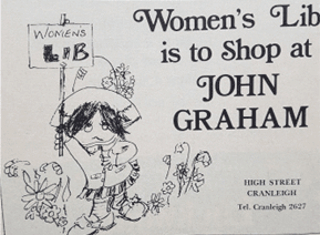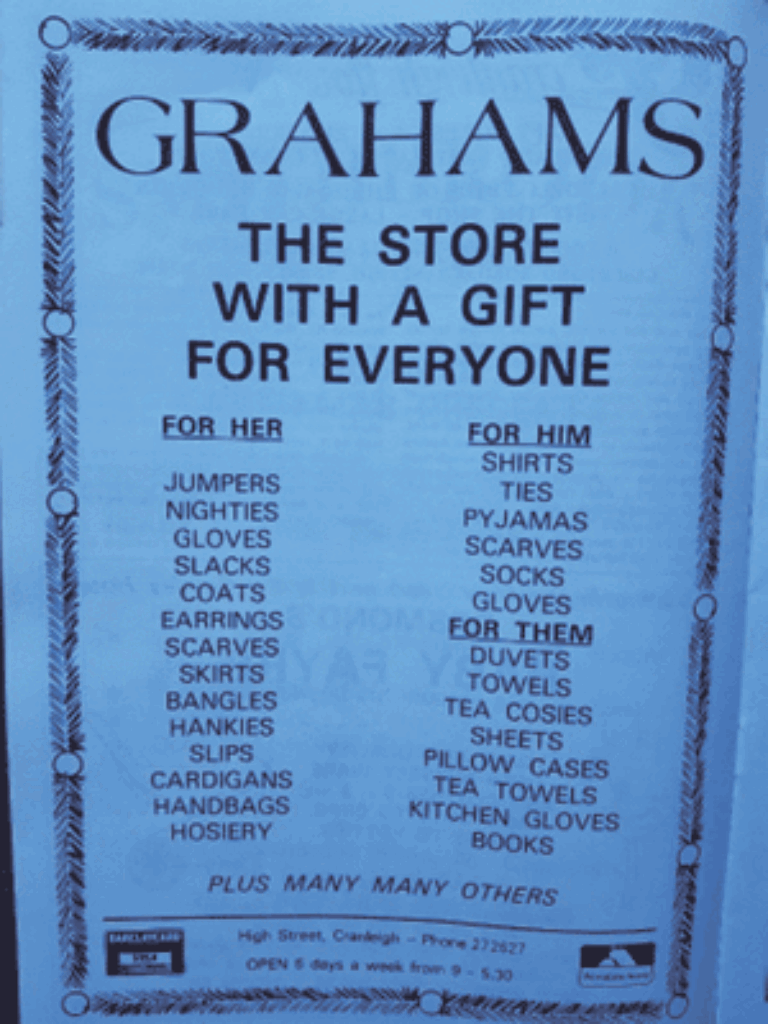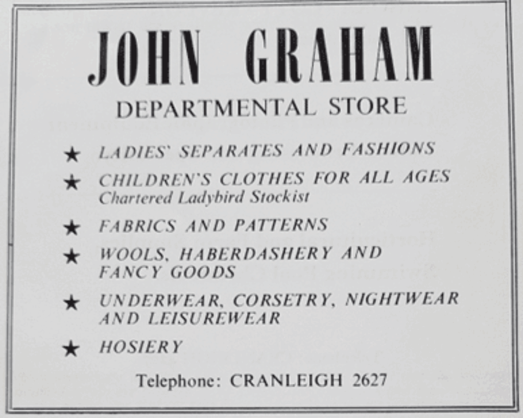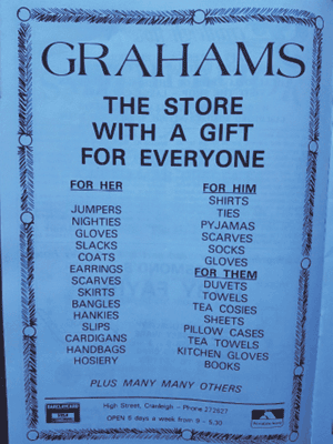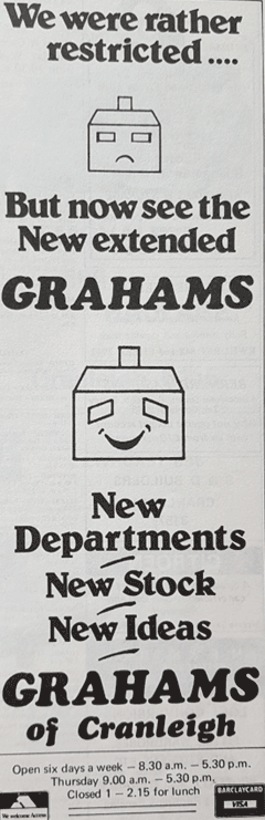 In 1959 ‘Jack and Jill’ was taken over by John Graham, a few years later it changed to his name, using the ground floor of ‘Clovelly’ and with a shop extension built in front of it. Next, it expanded into ‘Corndale’ next door and became a department store with an extensive range of goods. Its advert in 1972 was simple and factual, but the next year it introduced pictures and humour. An assortment of old adverts is given here as a nostalgic reminder of John Graham’s development and its stock.