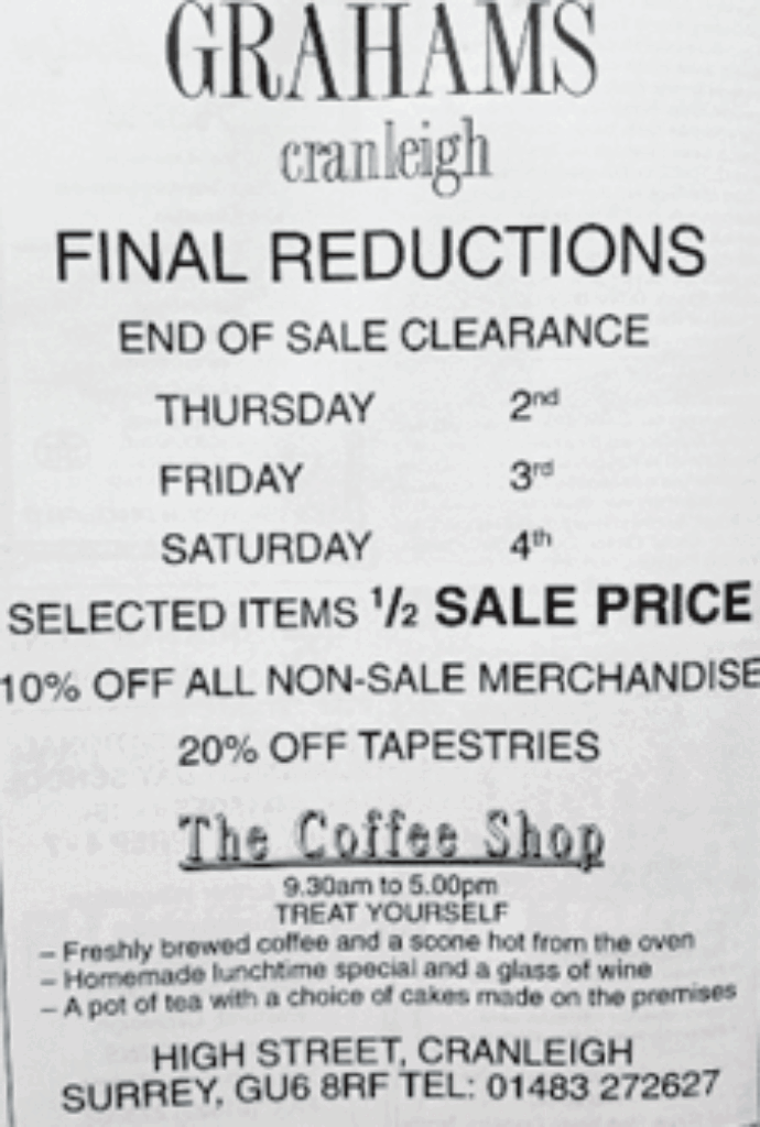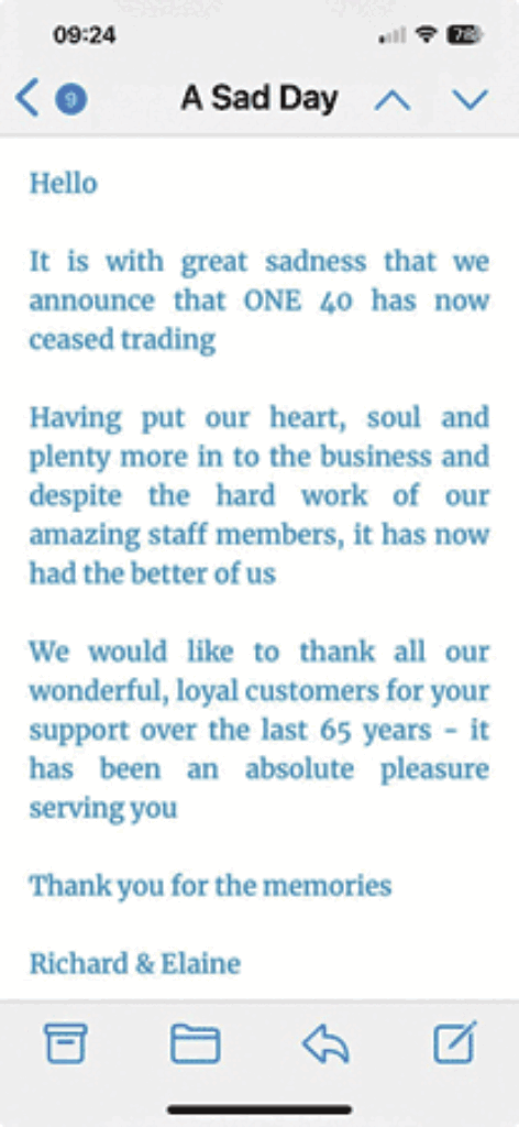 Thank you, One Forty and Graham family, for your contribution to Cranleigh since 1959 and for bringing beautiful items into our lives. We are already missing you.