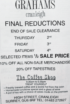In November 1988 – as a prelude to Christmas – Graham’s opened a coffee shop on the first floor, in place of the former materials department. It offered morning coffee, light lunches, afternoon teas and snacks. Homemade scones, cakes, biscuits and meringues were available at prices ranging from 30 to 75 pence.
