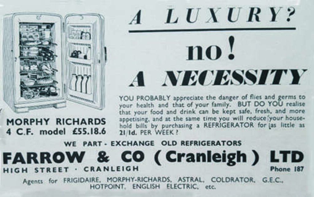 The improvement in household equipment, in particular the development of affordable fridges and freezers, has reduced the number of visits to food shops. Whereas within living memory meat and milk were kept in perforated zinc-and-wood meat safes, situated in the coolest part of the house, now food can be kept fresh much longer in a fridge. The advert by Farrow’s electrical goods shop says it all. In 1959, only about 13% of homes had a refrigerator, but in the 1960s they became common and were soon viewed as an essential item. Adverts ceased in local papers for farms and dairies offering deliveries of dairy produce daily or even twice daily.