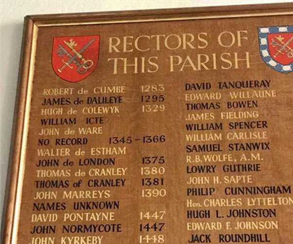 Part of the list of rectors displayed in Cranleigh parish church, showing Thomas Cranley
