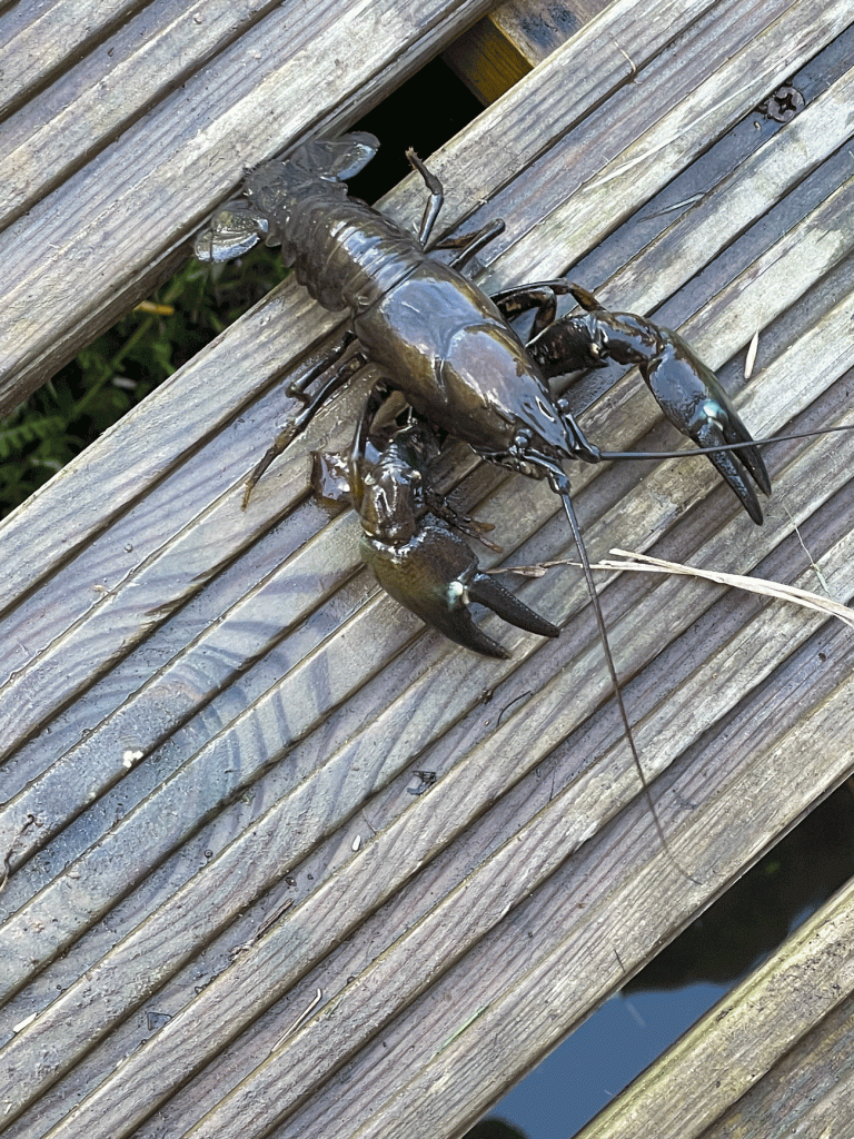 I wrote earlier in the year about the disappearance of the sticklebacks in the brook at the end of my garden. I know from friends who monitor the water quality round here that the brook was not in a very healthy state and wondered if pollution could have killed the little fish off. A more likely culprit has now appeared. A neighbour, also with access to the brook has found 3 signal crayfish, and managed to photograph one before it scuttled away, large claws waving about like the boxer, Mike Tyson. Already these pests have been sighted further up the brook. They were introduced in this country in 1975 to ‘enhance the experience’ as companies say when they attach those irritating cookies to your device to harvest information and sell it on for commercial purposes. In this case it was thought a good idea to ‘enhance’ the fishermen’s catch, especially as the creature is apparently delicious. Baked with breadcrumbs, or cold with mayo. The result is that now the pests have spread widely – and have almost completely obliterated our native white clawed crayfish. They have been almost wiped out in Surrey – with only two known sites remaining. My solution would be to declare an open season on the signal crayfish and if they are so tasty, with a bit of luck they will be overfished and some kind of balance restored. Has anyone got a creel?
