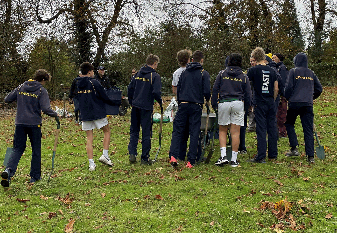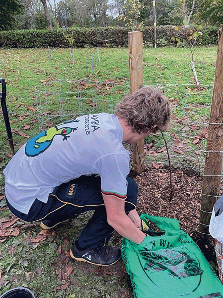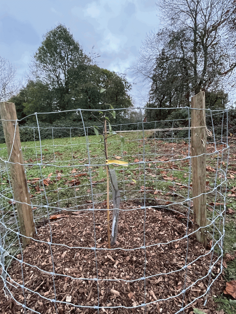 Recently, on a rather wet day, in a very wet week, volunteers of Beryl Harvey Fields, and the Cranleigh School outreach team led by Mark Weighton, met at our conservation site to plant some apple tree saplings which had been donated by Copse. This organisation works with Surrey County Council and aims to plant 1.2m trees by 2030. It is a social enterprise set up to network and engage with other community organisations and landowners. Members of Copse were on hand to help and give advice. The main challenge is to keep the new trees safe from rabbit damage. During a break in the work there was some delicious cider to sample.